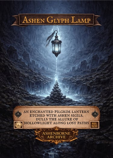 Each lamp bears a carved ashen glyph and burns with a dim, steady flame. The light is faint, yet the lure of nearby HollowLight weakens in its presence.