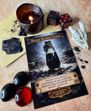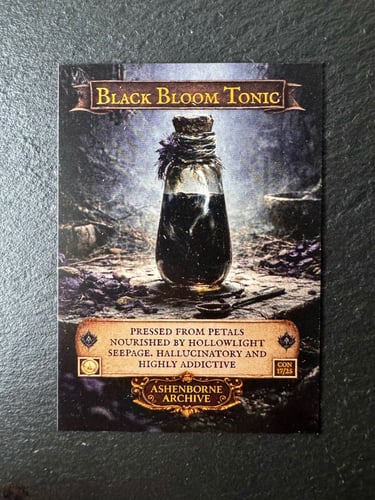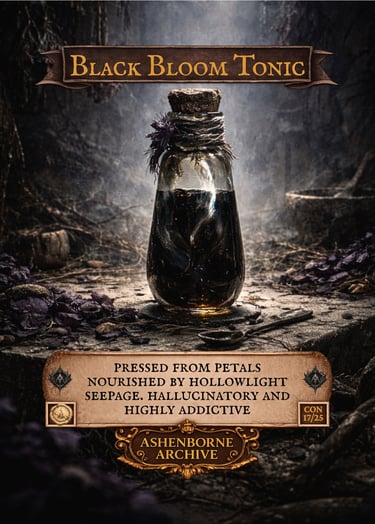 Black Bloom Tonic is a potent draught distilled from plants whose roots have absorbed seepage from nearby HollowLight wells.
