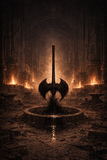 Fragments of old forge records claim the weapon was quenched within a HollowLight Well during its making, the metal drinking in the black radiance before it cooled.