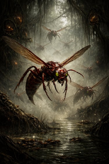 Their long barbed stingers carry a slow, burning venom that weakens prey before the swarm descends. Travelers who disturb a nest rarely escape the marsh before the poison takes hold.
