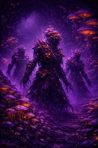 Tall, humanoid forms of hardened stalk and layered caps, they move slowly but with deliberate purpose. Their bodies carry networks of spore chambers that release faint drifting signals into the air.