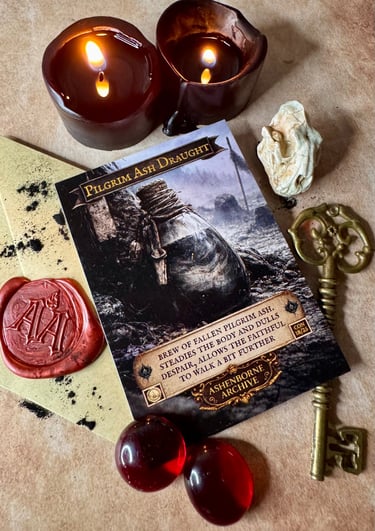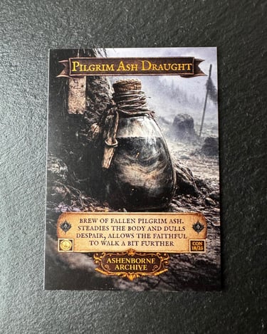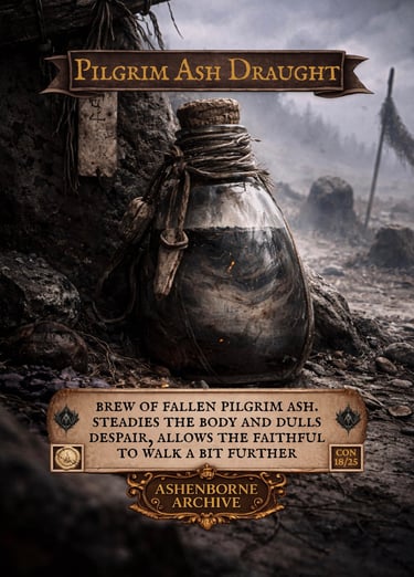 Pilgrim’s Ash Draught is brewed from the ashes of fallen pilgrims, gathered from roadside pyres and cremation fires along the long roads of AshenReach. The faithful believe that by drinking the ashes of those who walked before them, they inherit a fragment of their endurance.