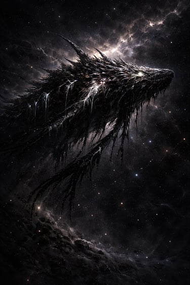 Ancient accounts describe a colossal celestial being crossing the void while bleeding HollowLight from its wounds — black radiance spilling into the darkness between worlds as it descended.