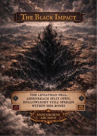 Ancient fragments speak of a dying celestial being — the Starfall Leviathan — descending from the void while bleeding black radiance from its wounds. When the creature struck the world, the impact carved a vast crater and shattered the surrounding lands for leagues in every direction.