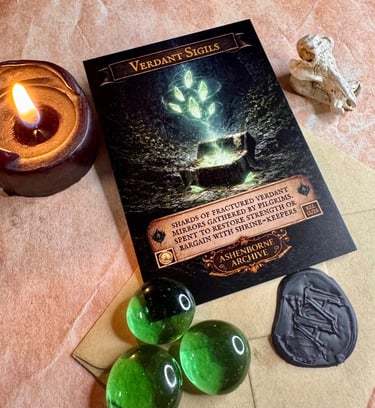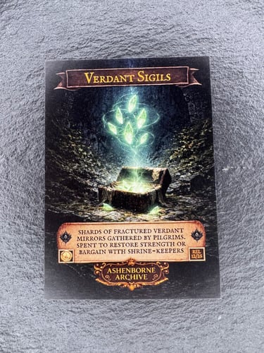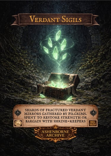 Verdant Sigils are ancient reflective relics now found only in scattered, fractured shards across AshenReach.